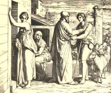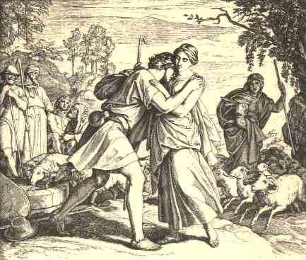 13 | And it came to pass, when Laban heard the tidings of Jacob his sister's son, that he ran to meet him, and embraced him, and kissed him, and brought him to his house. And he told Laban all these things. |