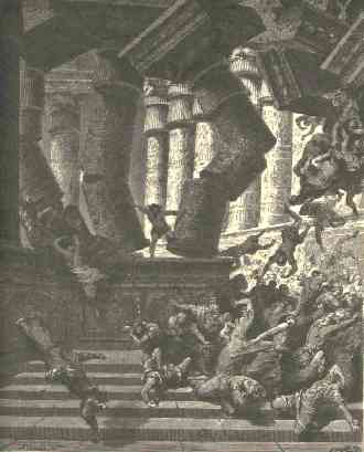 And Samson took hold of the two middle pillars upon which the house stood, and on which it was borne up, of the one with his right hand, and of the other with his left.