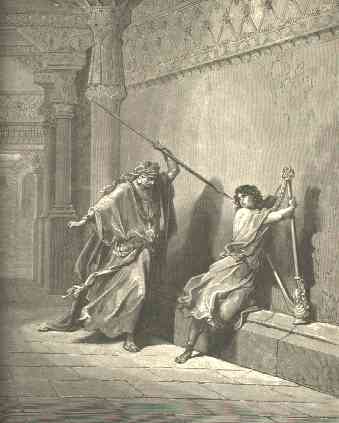 10 | And it came to pass on the morrow, that the evil spirit from God came upon Saul, and he prophesied in the midst of the house: and David played with his hand, as at other times: and there was a javelin in Saul's hand. |