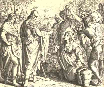 39 | And when David heard that Nabal was dead, he said, Blessed be the LORD, that hath pleaded the cause of my reproach from the hand of Nabal, and hath kept his servant from evil: for the LORD hath returned the wickedness of Nabal upon his own head. And David sent and communed with Abigail, to take her to him to wife. |