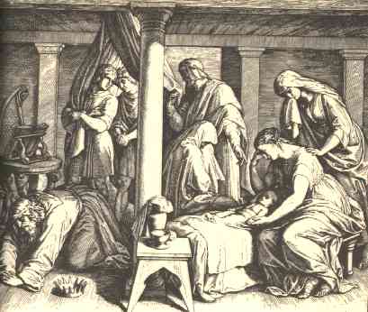 19 | But when David saw that his servants whispered, David perceived that the child was dead: therefore David said unto his servants, Is the child dead? And they said, He is dead. |